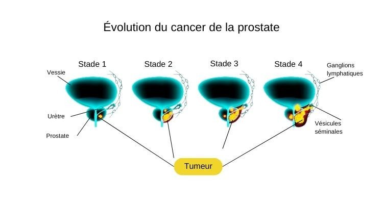 On distingue par ailleurs plusieurs stades d’évolution : le cancer de la prostate dit localisé (ou intracapsulaire) avec des cellules tumorales présente dans la prostate sans extension, et le cancer de la prostate extracapsulaire, dont les cellules ont traversé la capsule de la glande pour rejoindre les vaisseaux sanguins ou lymphatiques. La maladie peut alors se propager aux ganglions lymphatiques voisins ou atteindre d’autres organes et parties du corps à distance : ce sont les métastases. En présence d’un cancer de la prostate métastatique, les zones touchées se situent le plus souvent au niveau des os, du foie ou des poumons.